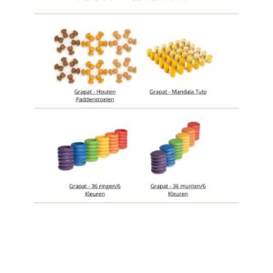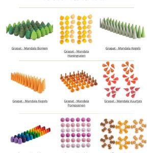 De kracht van deze Terug naar school bundel zit in de flexibiliteit. Veel opdrachten maken gebruik van de herkenbare Grapat loose parts, zoals mandala-onderdelen, ringen, munten, bomen, eieren en kegels. Kinderen worden uitgedaagd om te stapelen, tellen, sorteren op kleur en vormen te herkennen.