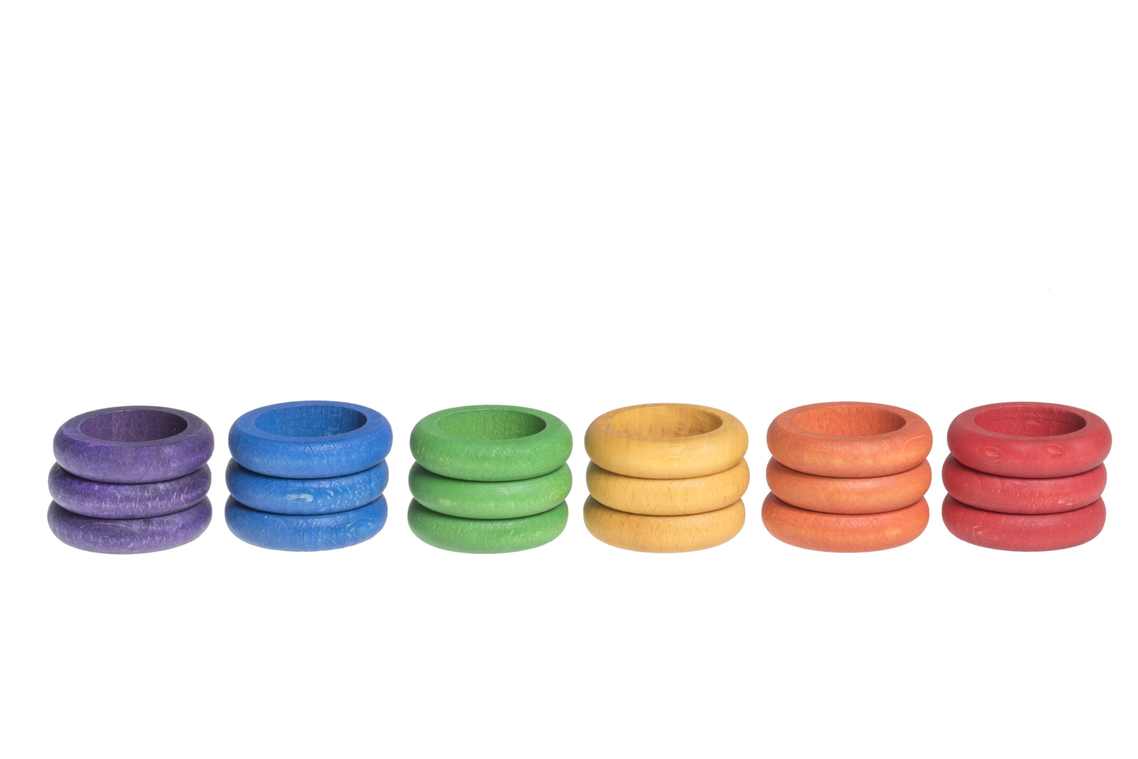 18 Houten ringen in 6 kleuren. Van elke kleur zitten er 3 ringen in deze set.