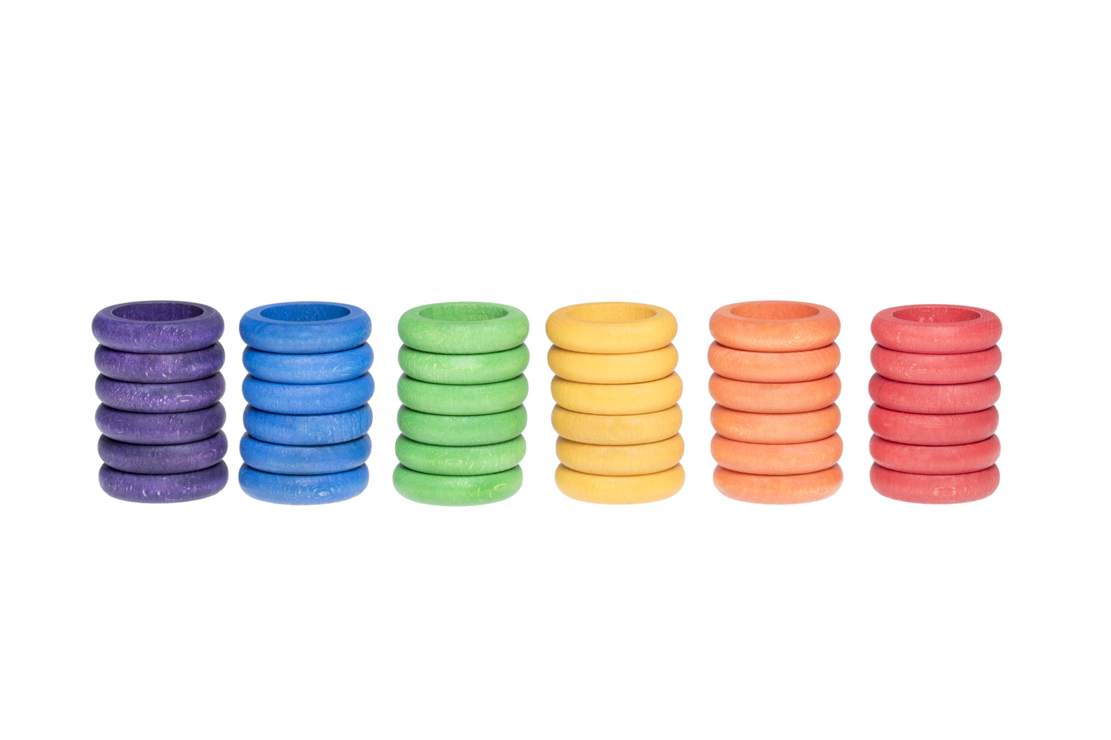 36 Houten ringen in 6 kleuren. Van elke kleur zitten er 6Â ringen in deze set.
