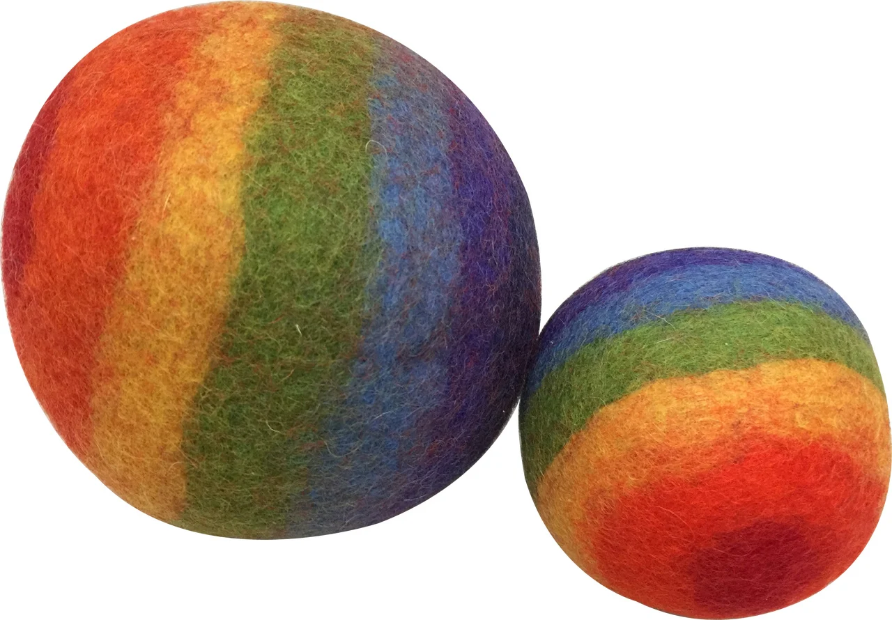 Set van 2 wollen vilten ballen met een formaat van 12,5 en 7,5Â centimeter. Door het formaat zijn de ballen geschikt voor elke leeftijd.